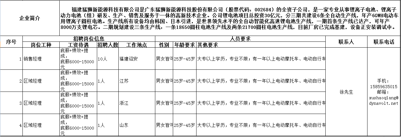 四、福建猛獅新能源科技有限公司 企業簡介:福建猛獅新能源科技有限公司是廣東猛獅新能源科技股份有限公司(股票代碼:002684)的全資子公司,是一家專業從事鋰離子電池、鋰離子動力電池(組)研發、生產、銷售及服務于一體的高新技術企業。公司鋰電池項目總投資30億元,分三期共建設6條全自動生產線,年產6GWH電動車用鋰離子圓柱電池。生產線所有設備均由韓國、日本引進,是世界領先水平的全自動智能化高速鋰電池生產線,一期首條生產線已達產,可年產8000萬支鋰電芯。二期規劃建設三條生產線:一條18650圓柱電池生產線及兩條21700圓柱電池生產線,目前廠房已完成基建,設備正安裝調試中。 企業地址:福建省漳州市詔安縣金都工業集中區