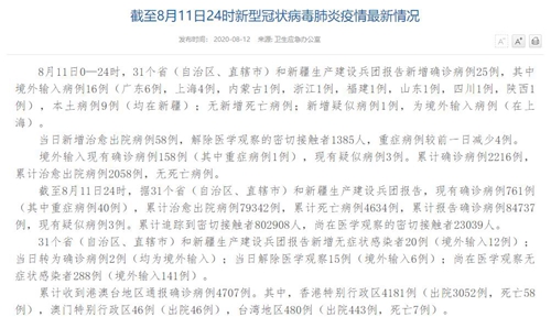 人民網北京8月12日電(董童)國家衛生健康委于今日在官網發布的《截至8月11日24時新型冠狀病毒肺炎疫情最新情況》(以下簡稱“情況”)提出,8月11日0—24時,31個?。ㄗ灾螀^、直轄市)和新疆生產建設兵團報告新增確診病例25例,其中境外輸入病例16例(廣東6例,上海4例,內蒙古1例,浙江1例,福建1例,山東1例,四川1例,陜西1例),本土病例9例(均在新疆);無新增死亡病例;新增疑似病例1例,為境外輸入病例(在上海)。當日新增治愈出院病例58例,解除醫學觀察的密切接觸者1385人,重癥病例較前一日減少4例。