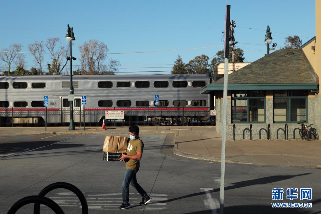 4月6日,一名行人拿著外賣走在美國加利福尼亞州北部小城圣馬特奧的火車站前。