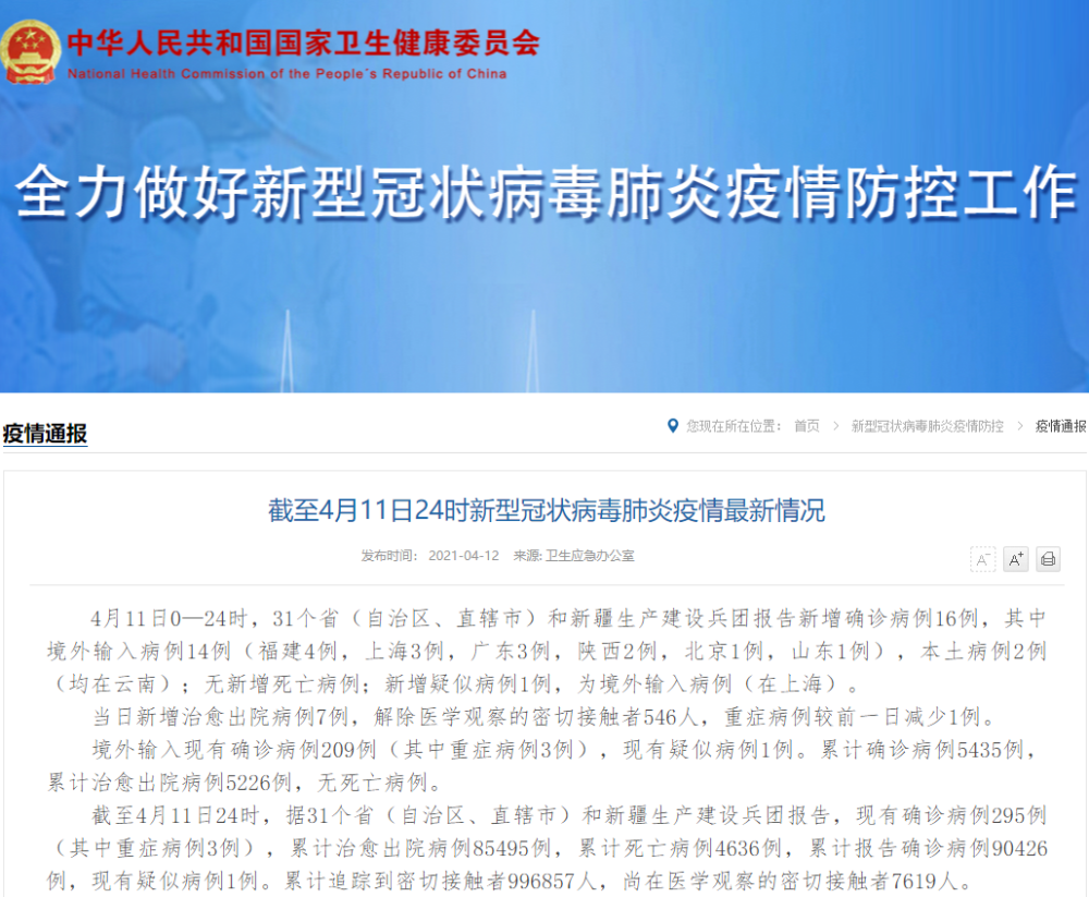 截至4月11日24時新型冠狀病毒肺炎疫情最新情況 4月11日0—24時,31個?。ㄗ灾螀^、直轄市)和新疆生產建設兵團報告新增確診病例16例,其中境外輸入病例14例(福建4例,上海3例,廣東3例,陜西2例,北京1例,山東1例),本土病例2例(均在云南);無新增死亡病例;新增疑似病例1例,為境外輸入病例(在上海)。 當日新增治愈出院病例7例,解除醫學觀察的密切接觸者546人,重癥病例較前一日減少1例。 境外輸入現有確診病例209例(其中重癥病例3例),現有疑似病例1例。累計確診病例5435例,累計治愈出院病例5226例,無死亡病例。 截至4月11日24時,據31個?。ㄗ灾螀^、直轄市)和新疆生產建設兵團報告,現有確診病例295例(其中重癥病例3例),累計治愈出院病例85495例,累計死亡病例4636例,累計報告確診病例90426例,現有疑似病例1例。累計追蹤到密切接觸者996857人,尚在醫學觀察的密切接觸者7619人。 31個?。ㄗ灾螀^、直轄市)和新疆生產建設兵團報告新增無癥狀感染者12例(均為境外輸入);當日轉為確診病例2例(均為境外輸入);當日解除醫學觀察5例(均為境外輸入);尚在醫學觀察無癥狀感染者301例(境外輸入276例)。 累計收到港澳臺地區通報確診病例12687例。其中,香港特別行政區11581例(出院11206例,死亡207例),澳門特別行政區49例(出院48例),臺灣地區1057例(出院1022例,死亡11例)。