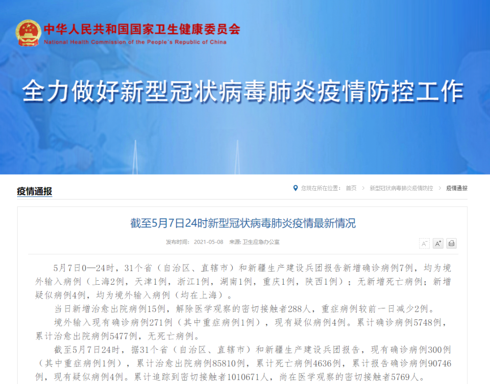 截至5月7日24時新型冠狀病毒肺炎疫情最新情況 5月7日0—24時,31個?。ㄗ灾螀^、直轄市)和新疆生產建設兵團報告新增確診病例7例,均為境外輸入病例(上海2例,天津1例,浙江1例,湖南1例,重慶1例,陜西1例);無新增死亡病例;新增疑似病例4例,均為境外輸入病例(均在上海)。 當日新增治愈出院病例15例,解除醫學觀察的密切接觸者288人,重癥病例較前一日減少2例。 境外輸入現有確診病例271例(其中重癥病例1例),現有疑似病例4例。累計確診病例5748例,累計治愈出院病例5477例,無死亡病例。 截至5月7日24時,據31個?。ㄗ灾螀^、直轄市)和新疆生產建設兵團報告,現有確診病例300例(其中重癥病例1例),累計治愈出院病例85810例,累計死亡病例4636例,累計報告確診病例90746例,現有疑似病例4例。累計追蹤到密切接觸者1010671人,尚在醫學觀察的密切接觸者5769人。 31個?。ㄗ灾螀^、直轄市)和新疆生產建設兵團報告新增無癥狀感染者8例(均為境外輸入);當日轉為確診病例2例(均為境外輸入);當日解除醫學觀察11例(均為境外輸入);尚在醫學觀察的無癥狀感染者313例(境外輸入306例)。 累計收到港澳臺地區通報確診病例13028例。其中,香港特別行政區11801例(出院11473例,死亡210例),澳門特別行政區49例(出院49例),臺灣地區1178例(出院1077例,死亡12例)。
