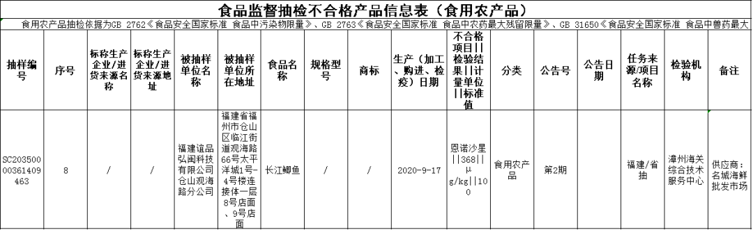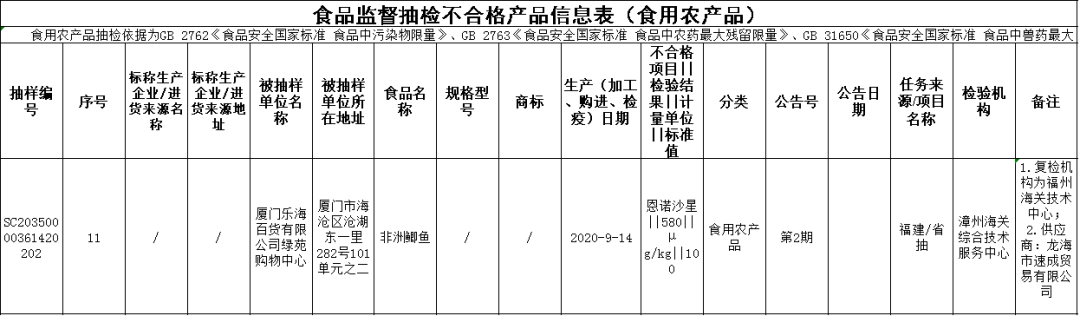 農獸藥殘留問題 ◆永定區鳳城百里鮮餐館銷售的油蛤(購進日期為2020年10月26日),恩諾沙星不合格,檢驗機構為福建賽福食品檢測研究所有限公司; ◆泉州新華都購物廣場有限公司晉江磁灶店銷售的草鱺魚(購進日期為2020年8月11日),呋喃唑酮代謝物不合格、氧氟沙星不合格,初檢機構為漳州海關綜合技術服務中心,復檢機構為廈門海關技術中心; ◆中閩百匯(中國)零售集團有限公司晉江橋南分公司銷售的冰鮮海鱸魚(購進日期為2020年8月8日),恩諾沙星不合格,初檢機構為漳州海關綜合技術服務中心,復檢機構為福州海關技術中心; ◆漳州新華都百貨有限責任公司元光店銷售的土雞蛋(購進日期為2020年8月17日),氟苯尼考不合格,初檢機構為廈門海關技術中心,復檢機構為福建省產品質量檢驗研究院; ◆泉州市洛江區萬安??吐〕袖N售的上海青(購進日期為2020年8月24日),毒死蜱不合格,初檢機構為廈門海關技術中心,復檢機構為福建中檢華日食品安全檢測有限公司; ◆漳州新華都百貨有限責任公司丹霞店銷售的油蛤(購進日期為2020年8月25日),恩諾沙星不合格,初檢機構為漳州海關綜合技術服務中心,復檢機構為福建中檢華日食品安全檢測有限公司; ◆福建永輝超市有限公司莆田市水韻城店銷售的草鱺(購進日期為2020年8月26日),氧氟沙星不合格,初檢機構為漳州海關綜合技術服務中心,復檢機構為福州海關技術中心; ◆福建誼品弘閩科技有限公司倉山觀海路分公司銷售的長江鯽魚(購進日期為2020年9月17日),恩諾沙星不合格,檢驗機構為漳州海關綜合技術服務中心; ◆福建永輝超市有限公司莆田市荔城區黃石鎮晴嵐店銷售的草鱺(購進日期為2020年8月27日),氧氟沙星不合格,初檢機構為漳州海關綜合技術服務中心,復檢機構為福建省產品質量檢驗研究院; ◆羅源縣金源瑞都超市有限公司銷售的多寶魚(購進日期為2020年9月12日),恩諾沙星不合格、氧氟沙星不合格,檢驗機構為漳州海關綜合技術服務中心; ◆廈門樂海百貨有限公司綠苑購物中心銷售的非洲鯽魚(購進日期為2020年9月14日),恩諾沙星不合格,初檢機構為漳州海關綜合技術服務中心,復檢機構為福州海關技術中心; ◆泉州新華都購物廣場有限公司湖心店銷售的雞腿(購進日期為2020年8月26日),呋喃西林代謝物(SEM)不合格,初檢機構為廣州廣電計量檢測股份有限公司,復檢機構為福建省產品質量檢驗研究院; ◆福建冠業投資發展有限公司漳平圣宇廣場店銷售的龍膽魚(購進日期為2020年10月21日),呋喃唑酮代謝物不合格,檢驗機構為漳州海關綜合技術服務中心; ◆長泰縣寶國海產品攤銷售的鱸魚(購進日期為2020年10月28日),氯霉素不合格,檢驗機構為漳州海關綜合技術服務中心; ◆新羅區阿妹海產品攤銷售的明蝦(購進日期為2020年10月28日),呋喃唑酮代謝物不合格,檢驗機構為漳州海關綜合技術服務中心; ◆沙縣農興海鮮超市銷售的龍膽魚(購進日期為2020年10月28日),呋喃唑酮代謝物不合格,檢驗機構為漳州海關綜合技術服務中心。