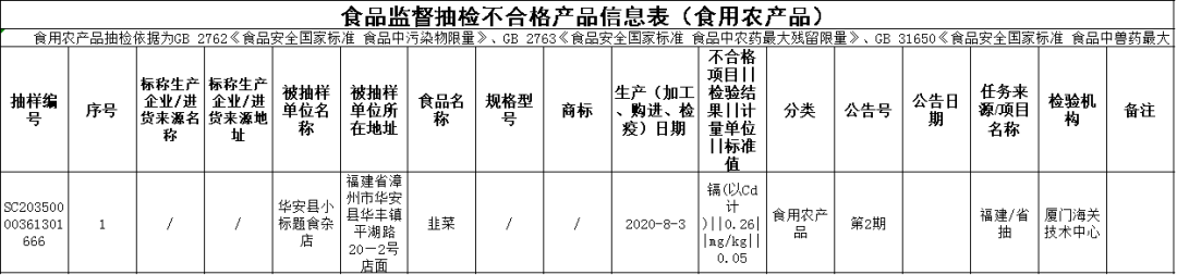 重金屬污染問題 ◆華安縣小標題食雜店銷售的韭菜(購進日期為2020年8月3日),鎘(以Cd計)不合格,檢驗機構為廈門海關技術中心;
