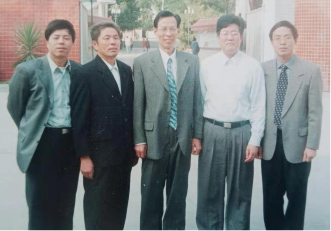 2000年12月,來莆田二中掛副校長職的西吉中學副校長伏彥林臨別前與莆田二中領導合影留念。自左至右:方祖禧、姚金標、涂雨、伏彥林、彭志強。