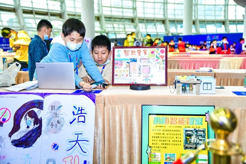 以《智能家庭小助手》為主題的創意編程搭建比賽共有20支隊伍進入決賽,參賽戰隊將投稿的創意作品進行現場展示。選手們發揮自身的創造力和想象力搭建作品,并通過周邊物料對自己的作品展區進行布置,利用不同的裝飾風格來展示自己的戰隊文化?,F場展現了AI讀書數娃、智能搭配衣柜、家庭智能控制中心、分體式樓梯清洗系統等各種創意作品。