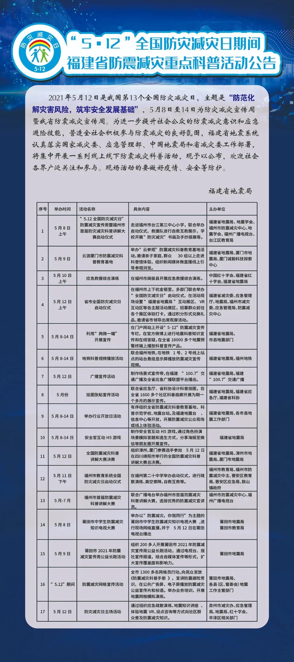 “5?12”全國防災減災日期間福建省防震減災重點科普活動公告