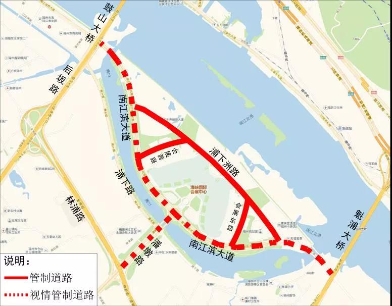 二、2021年6月18日12:00至18:00和2021年6月19日至20日每日7:00至18:00,對浦下洲路、會展東路、會展西路實行交通管制,禁止車輛(除持專用通行證車輛、公交車、出租車外)通行,南江濱大道(魁浦大橋下至鼓山大橋下)禁止所有車輛(含公交車和出租車)???。