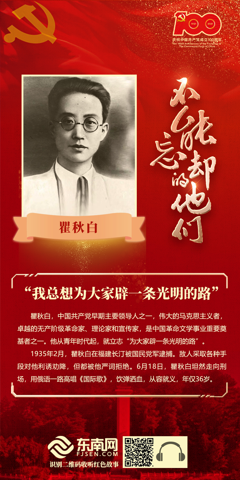 紀念是為了更好的前行。86年前的今天,中國共產黨早期主要領導人之一、偉大的馬克思主義者、卓越的無產階級革命家瞿秋白在龍巖長汀慷慨就義,東南網特別推出“不能忘卻的他們”系列融媒體產品第一期《瞿秋白:“為大家辟一條光明的路”》,緬懷革命先烈、重溫紅色故事,汲取源源不斷的奮進力量。
