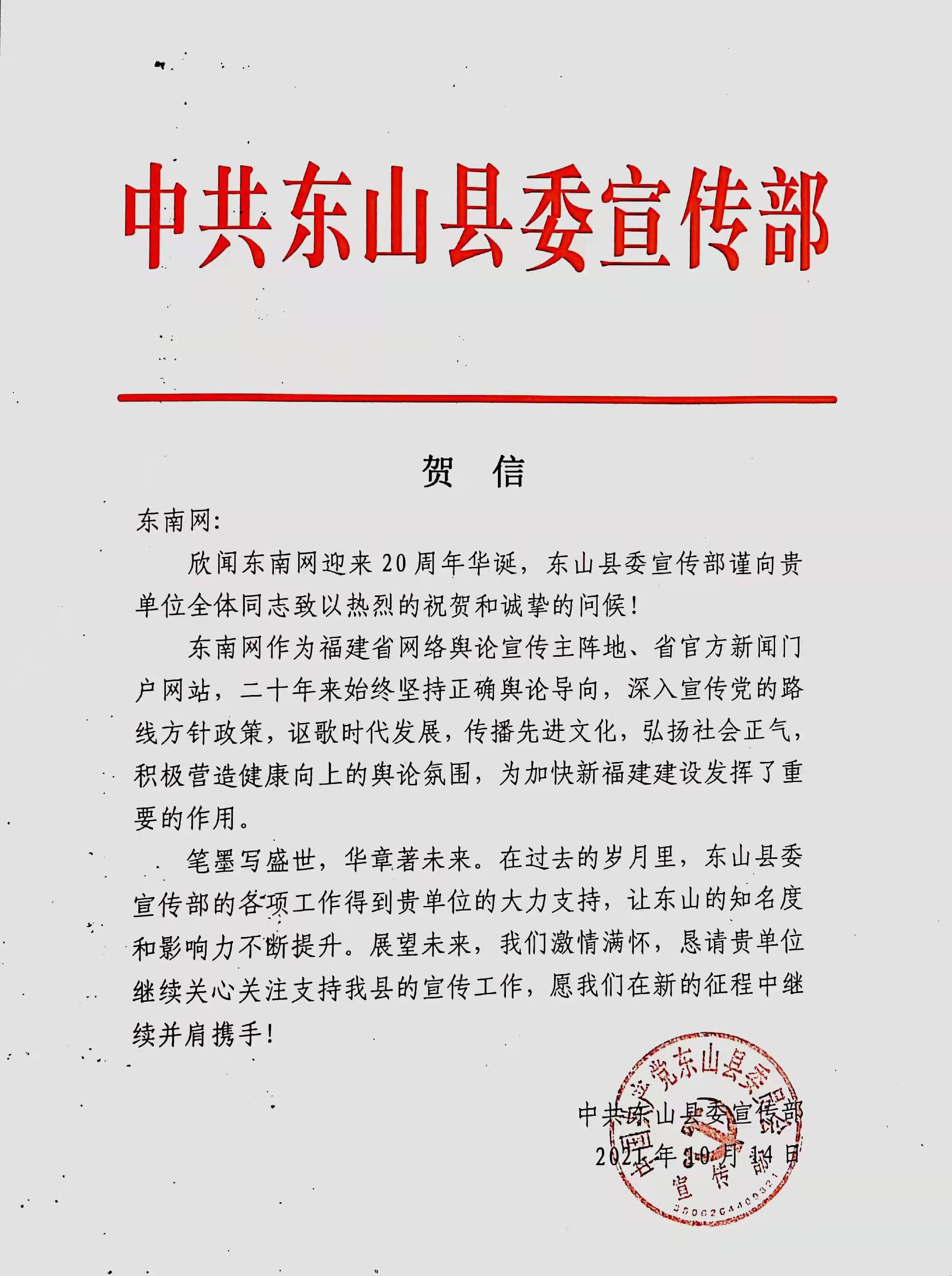 中共東山縣委宣傳部賀信