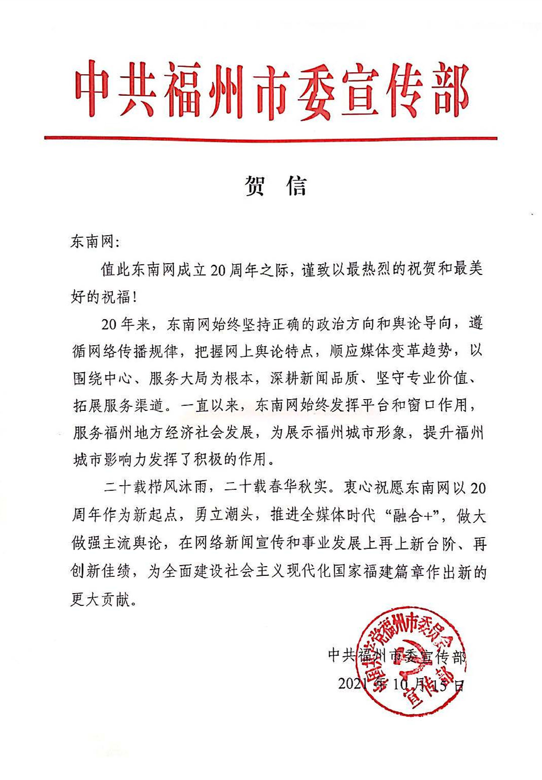 中共福州市委宣傳部賀信