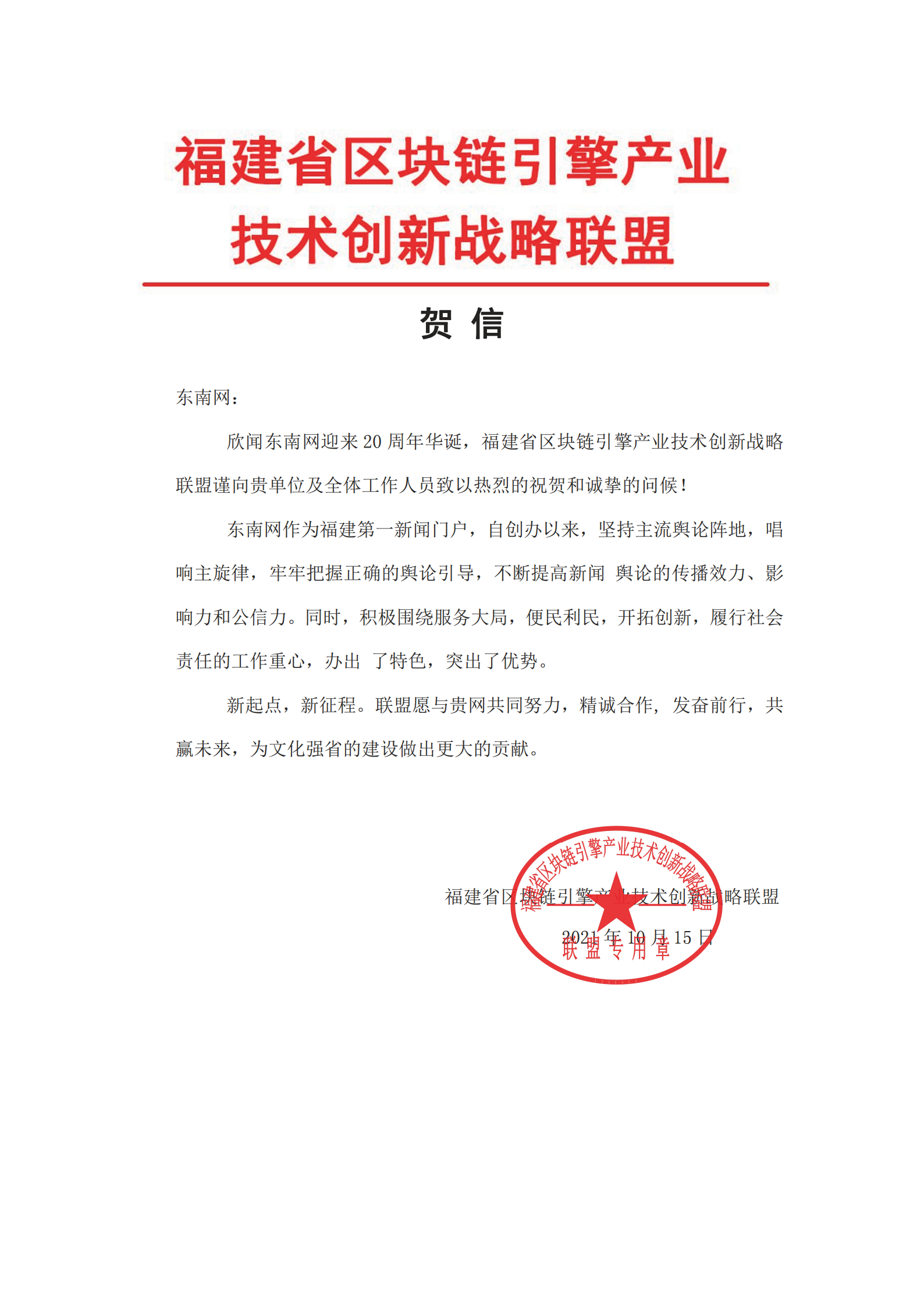 福建省區塊鏈引擎產業技術創新戰略聯盟賀信