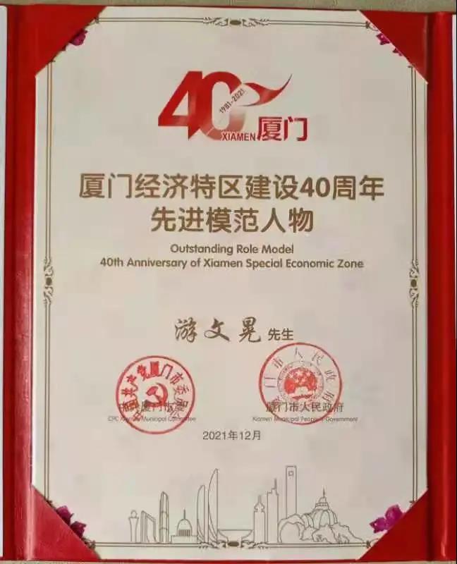 12月22日,廈門經濟特區建設40周年慶祝大會舉行。退役軍人游文晃喜獲“廈門經濟特區建設40周年先進模范人物”榮譽。