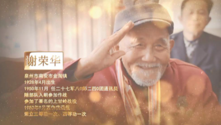 1948年2月,謝榮華正式入伍。后來,他隨部隊進入朝鮮,參加了著名的上甘嶺戰役。謝榮華說,上甘嶺一戰長達40多天,他參與作戰近1個月,參加了8次戰斗。 在謝榮華參與的最后一次戰斗中,當看到機槍手犧牲后,身為通訊員的他義無反顧地沖上前,架起機槍繼續作戰。就在此時,敵方的一枚炮彈突然落在謝榮華的背后爆炸了,指導員當場犧牲,謝榮華也被炸暈了過去?!靶褋頃r都不知道自己在哪里,只感覺后背非常痛?!焙髞?,謝榮華跟隨部隊輾轉至蘇聯接受治療,因為后背皮膚嚴重受損,醫生從其腹部取皮瓣進行植皮,因此留下二三十厘米長的疤痕。 1953年9月,謝榮華因傷病退伍,榮立三等功一次、四等功一次。退伍后的謝榮華很少與外人提起自己受傷的過往,更沒有提起自己立功的事。他最希望傳給兒孫們的是敢于奉獻、不求回報的精神。