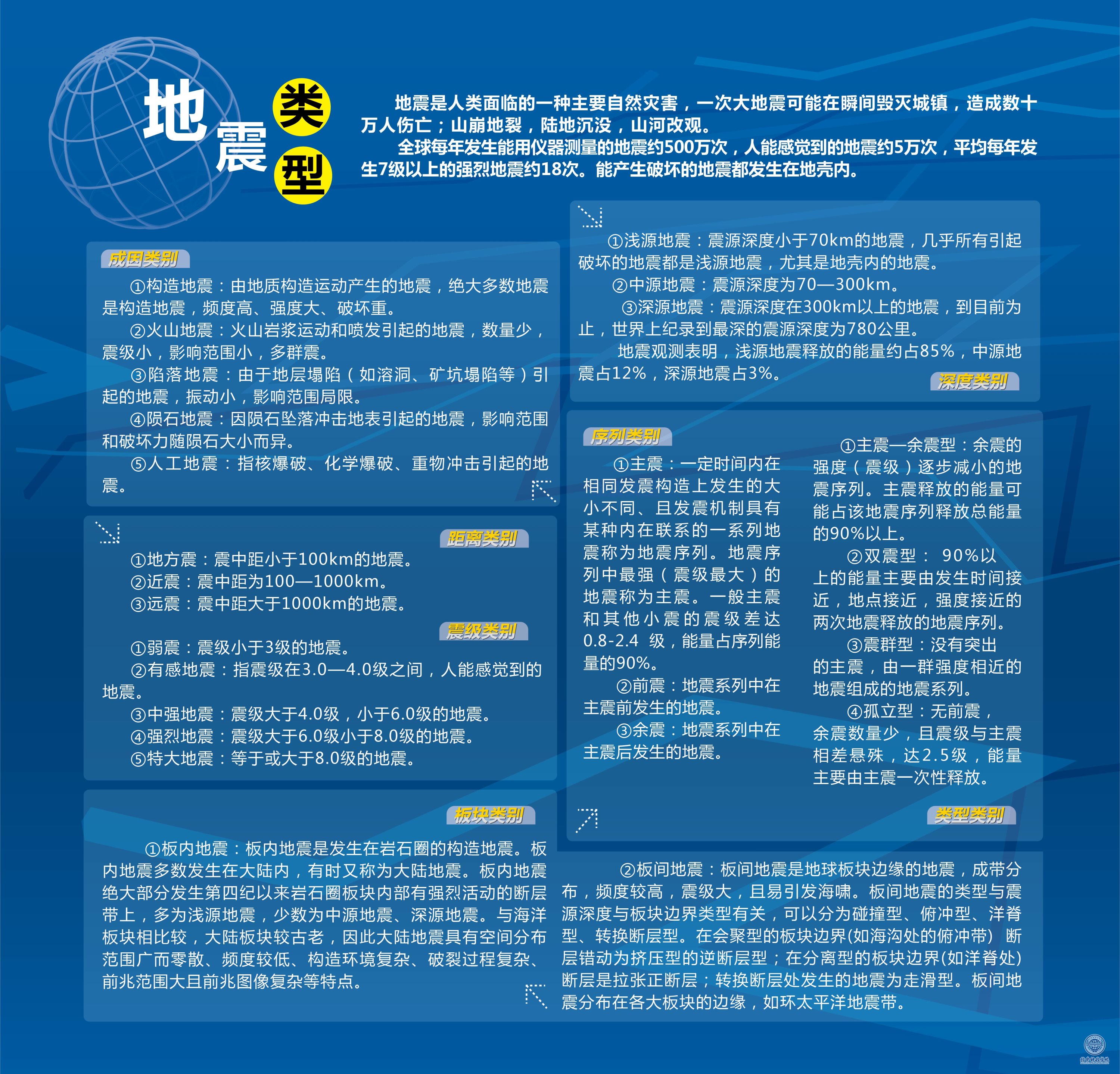 地震是人類面臨的一種主要自然災害,一次大地震可能在瞬間毀滅城鎮,造成數十萬人傷亡;山崩地裂,陸地沉沒,山河改觀。 全球每年發生能用儀器測量的地震約500萬次,人能感覺到的地震約5萬次,平均每年發生7級以上的強烈地震約18次。能產生破壞的地震都發生在地殼內。 成因類別 ①構造地震:由地質構造運動產生的地震,絕大多數地震是構造地震,頻度高、強度大、破壞重。 ②火山地震:火山巖漿運動和噴發引起的地震,數量少,震級小,影響范圍小,多群震。 ③陷落地震:由于地層塌陷(如溶洞、礦坑塌陷等)引起的地震,振動小,影響范圍局限。 ④隕石地震:因隕石墜落沖擊地表引起的地震,影響范圍和破壞力隨隕石大小而異。 ⑤人工地震:指核爆破、化學爆破、重物沖擊引起的地震。 深度類別 ①淺源地震:震源深度小于70km的地震,幾乎所有引起破壞的地震都是淺源地震,尤其是地殼內的地震。 ②中源地震:震源深度為70—300km。 ③深源地震:震源深度在300km以上的地震,到目前為止,世界上紀錄到最深的震源深度為780公里。 地震觀測表明,淺源地震釋放的能量約占85%,中源地震占12%,深源地震占3%。 距離類別 ①地方震:震中距小于100km的地震。 ②近震:震中距為100—1000km。 ③遠震:震中距大于1000km的地震。 震級類別 ①弱震:震級小于3級的地震。 ②有感地震:指震級在3.0—4.0級之間,人能感覺到的地震。 ③中強地震:震級大于4.0級,小于6.0級的地震。 ④強烈地震:震級大于6.0級小于8.0級的地震。 ⑤特大地震:等于或大于8.0級的地震。 序列類別 ①主震:一定時間內在相同發震構造上發生的大小不同、且發震機制具有某種內在聯系的一系列地震稱為地震序列。地震序列中最強(震級最大)的地震稱為主震。一般主震和其他小震的震級差達0.8-2.4 級,能量占序列能量的90%。 ②前震:地震系列中在主震前發生的地震。 ③余震:地震系列中在主震后發生的地震。 類型類別 ①主震—余震型:余震的強度(震級)逐步減小的地震序列。主震釋放的能量可能占該地震序列釋放總能量的90%以上。 ②雙震型:90%以上的能量主要由發生時間接近,地點接近,強度接近的兩次地震釋放的地震序列。 ③震群型:沒有突出的主震,由一群強度相近的地震組成的地震系列。 ④孤立型:無前震,余震數量少,且震級與主震相差懸殊,達2.5級,能量主要由主震一次性釋放。 板塊類別 ①板內地震:板內地震是發生在巖石圈的構造地震。板內地震多數發生在大陸內,有時又稱為大陸地震。板內地震絕大部分發生第四紀以來巖石圈板塊內部有強烈活動的斷層帶上,多為淺源地震,少數為中源地震、深源地震。與海洋板塊相比較,大陸板塊較古老,因此大陸地震具有空間分布范圍廣而零散、頻度較低、構造環境復雜、破裂過程復雜、前兆范圍大且前兆圖像復雜等特點。 ②板間地震:板間地震是地球板塊邊緣的地震,成帶分布,頻度較高,震級大,且易引發海嘯。板間地震的類型與震源深度與板塊邊界類型有關,可以分為碰撞型、俯沖型、洋脊型、轉換斷層型。在會聚型的板塊邊界(如海溝處的俯沖帶) 斷層錯動為擠壓型的逆斷層型;在分離型的板塊邊界(如洋脊處) 斷層是拉張正斷層;轉換斷層處發生的地震為走滑型。板間地震分布在各大板塊的邊緣,如環太平洋地震帶。 |