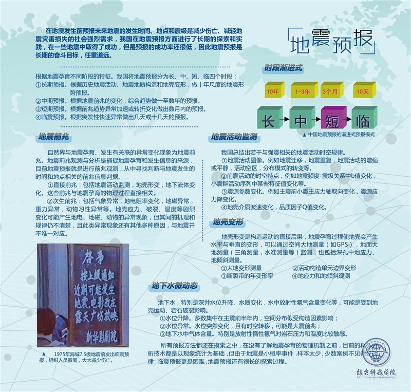 在地震發生前預報未來地震的發生時間、地點和震級是減少傷亡、減輕地震災害損失的社會強烈需求,我國在地震預報方面進行了長期的探索和實踐,在一些地震中取得了成功,但是預報的成功率還很低,因此地震預報是長期的奮斗目標,任重道遠。 時段漸進式 根據地震孕育不同階段的特征。我國將地震預報分為長、中、短、臨四個時段: ①長期預報。根據歷史地震活動、地震地質構造和地殼變形,做十年尺度的地震形勢預報。 ②中期預報。根據地震前兆的變化,綜合趨勢做一至數年的預報。 ③短期預報。根據前兆趨勢異常加速或轉折變化做出數月內的預報。 ④臨震預報。根據突發性快速異常做出幾天或十幾天的預報。 地震前兆 自然界與地震孕育、發生有關聯的異常變化現象為地震前兆。 ①直接前兆:包括地震活動監測,地殼形變,地下流體變化。這些前兆與地震孕育的物理過程直接相關。 ②次生前兆:包括地電阻率變化,地磁異常,重力異常,動物習性異常等。 |