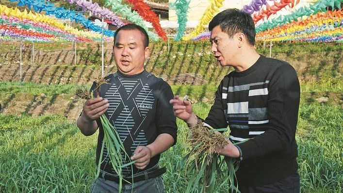 胡超(右一)向農戶林站源了解大蒜種植情況