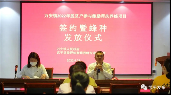 近日,武平縣萬安鎮2022年脫貧戶參與激勵幫扶養蜂項目簽約暨蜂種發放儀式在石燎閣蜜蜂科普基地舉行,基地負責人退役老兵鐘亮生為10位幫扶脫貧戶現場頒發了蜜蜂認養證書,并指導他們做好蜜蜂日常管理。