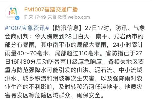 [FM1007]省防指啟動防暴雨Ⅲ級應急響應