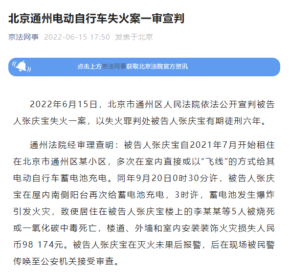有期徒刑6年!北京通州電動自行車失火致5人亡案一審宣判