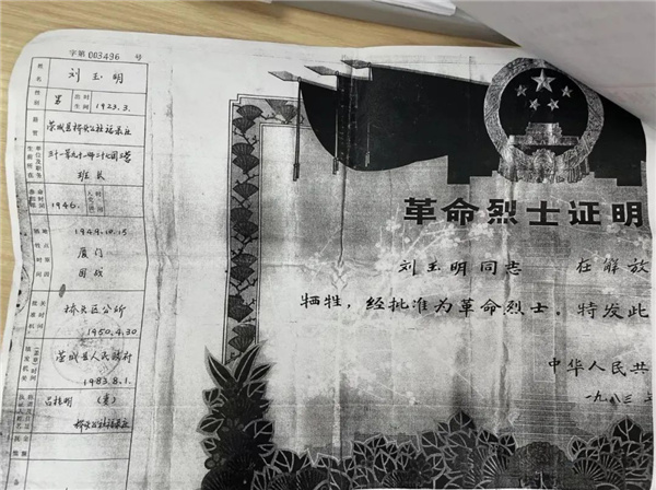 當天下午,劉昌存來到龍海區退役軍人服務中心,向工作人員出示了一張革命烈士證明書,劉昌存向工作人員介紹了父親劉玉明的事跡。1946年劉玉明從山東榮成縣橋頭公社參軍入伍,1948年因傷回家休養,同年養完傷后回歸原部隊。此時妻子呂桂明已經懷有身孕,1949年10月,劉玉明因戰犧牲,部隊根據他本人所留地址將革命烈士證明送到家鄉(原件收藏于當地博物館),并留下口信,交代劉玉明犧牲后安葬于海澄縣革命烈士陵園。