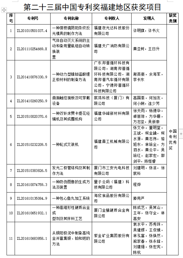 喜報!第二十三屆中國專利獎福建地區獲獎量取得“大豐收”