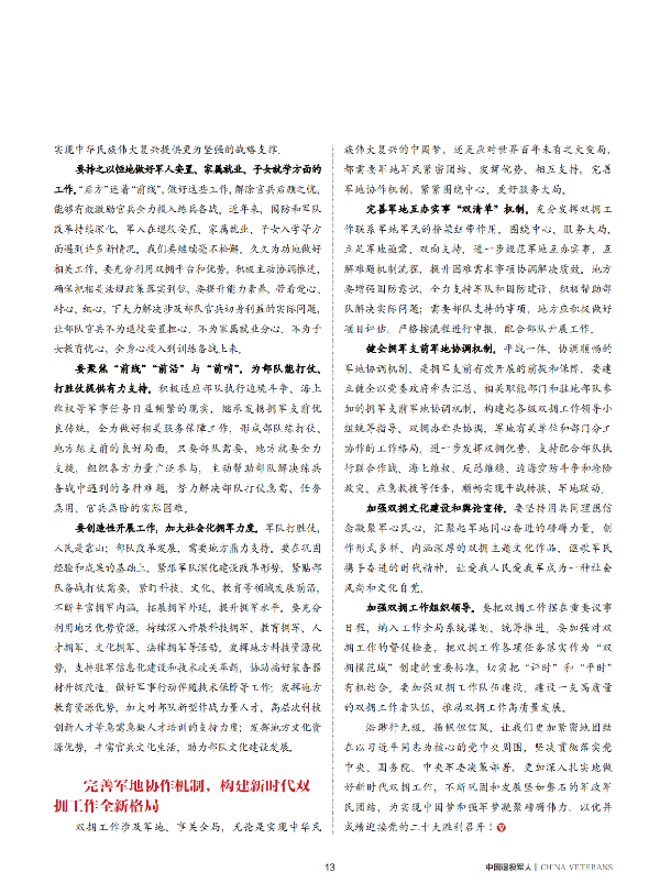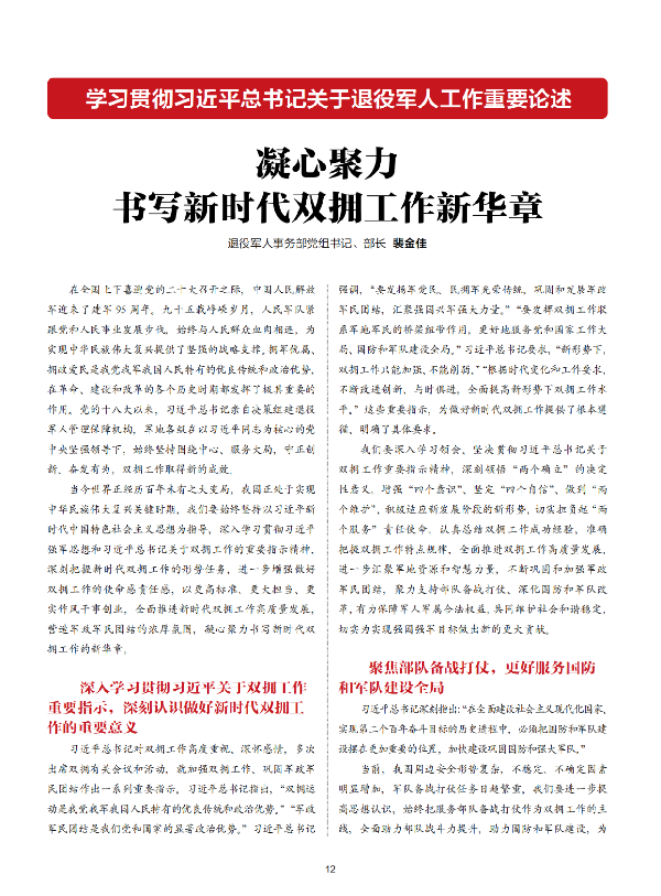 《中國退役軍人》雜志2022年第八期在重要位置推出“學習貫徹習近平總書記關于退役軍人工作重要論述”專欄,刊發了退役軍人事務部黨組書記、部長裴金佳署名文章《凝心聚力書寫新時代雙擁工作新華章》。 凝心聚力書寫新時代雙擁工作新華章 退役軍人事務部黨組書記、部長 裴金佳 在全國上下喜迎黨的二十大召開之際,中國人民解放軍迎來了建軍95 周年。九十五載崢嶸歲月,人民軍隊緊跟黨和人民事業發展步伐,始終與人民群眾血肉相連,為實現中華民族偉大復興提供了堅強的戰略支撐。擁軍優屬、擁政愛民是我黨我軍我國人民特有的優良傳統和政治優勢,在革命、建設和改革的各個歷史時期都發揮了極其重要的作用。黨的十八大以來,習近平總書記親自決策組建退役軍人管理保障機構,軍地各級在以習近平同志為核心的黨中央堅強領導下,始終堅持圍繞中心、服務大局,守正創新、奮發有為,雙擁工作取得新的成效。 當今世界正經歷百年未有之大變局,我國正處于實現中華民族偉大復興關鍵時期,我們要始終堅持以習近平新時代中國特色社會主義思想為指導,深入學習貫徹習近平強軍思想和習近平總書記關于雙擁工作的重要指示精神,深刻把握新時代雙擁工作的形勢任務,進一步增強做好雙擁工作的使命感責任感,以更高標準、更大擔當、更實作風干事創業,全面推進新時代雙擁工作高質量發展,營造軍政軍民團結的濃厚氛圍,凝心聚力書寫新時代雙擁工作的新華章。 深入學習貫徹習近平關于雙擁工作重要指示 深刻認識做好新時代雙擁工作的重要意義 習近平總書記對雙擁工作高度重視、深懷感情,多次出席雙擁有關會議和活動,就加強雙擁工作、鞏固軍政軍民團結作出一系列重要指示。習近平總書記指出,“雙擁運動是我黨我軍我國人民特有的優良傳統和政治優勢?!薄败娬娒駡F結是我們黨和國家的顯著政治優勢?!绷暯娇倳洀娬{,“要發揚軍愛民、民擁軍光榮傳統,鞏固和發展軍政軍民團結,匯聚強國興軍強大力量?!薄耙l揮雙擁工作聯系軍地軍民的橋梁紐帶作用,更好地服務黨和國家工作大局、國防和軍隊建設全局?!绷暯娇倳浺?,“新形勢下,雙擁工作只能加強、不能削弱?!薄案鶕r代變化和工作要求,不斷改進創新、與時俱進,全面提高新形勢下雙擁工作水平?!边@些重要指示,為做好新時代雙擁工作提供了根本遵循、明確了具體要求。 我們要深入學習領會、堅決貫徹習近平總書記關于雙擁工作的重要指示精神,深刻領悟“兩個確立”的決定性意義,增強“四個意識”、堅定“四個自信”、做到“兩個維護”,積極適應新發展階段的新形勢,切實擔負起“兩個服務”責任使命,認真總結雙擁工作成功經驗,準確把握雙擁工作特點規律,全面推進雙擁工作高質量發展,進一步匯聚軍地資源和智慧力量,不斷鞏固和加強軍政軍民團結,聚力支持部隊備戰打仗、深化國防和軍隊改革,有力保障軍人軍屬合法權益,共同維護社會和諧穩定,切實為實現強國強軍目標做出新的更大貢獻。 聚焦部隊備戰打仗 更好服務國防和軍隊建設全局 習近平總書記深刻指出:“在全面建設社會主義現代化國家、實現第二個百年奮斗目標的歷史進程中,必須把國防和軍隊建設擺在更加重要的位置,加快建設鞏固國防和強大軍隊?!?/p> 當前,我國周邊安全形勢復雜,不穩定、不確定因素明顯增加,軍隊備戰打仗任務日趨繁重。我們要進一步提高思想認識,始終把服務部隊備戰打仗作為雙擁工作的主線,全面助力部隊戰斗力提升,助力國防和軍隊建設,為實現中華民族偉大復興提供更為堅強的戰略支撐。 要持之以恒地做好軍人安置、家屬就業、子女就學方面的工作。“后方”連著“前線”,做好這些工作,解除官兵后顧之憂,能夠有效激勵官兵全力投入練兵備戰。近年來,國防和軍隊改革持續深化,軍人在退役安置、家屬就業、子女入學等方面遇到許多新情況。我們要繼續毫不松懈、久久為功地做好相關工作,要充分利用雙擁平臺和優勢,積極主動協調推進,確保把相關法規政策落實到位,要提升能力素養,帶著愛心、耐心、細心,下大力解決涉及部隊官兵切身利益的實際問題,讓部隊官兵不為退役安置擔心、不為家屬就業分心、不為子女教育憂心,全身心投入到訓練備戰上來。 要聚焦“前線”“前沿”與“前哨”,為部隊能打仗、打勝仗提供有力支持。積極適應部隊執行邊境斗爭、海上維權等軍事任務日益頻繁的現實,繼承發揚擁軍支前優良傳統,全力做好相關服務保障工作,形成部隊練打仗、地方練支前的良好局面。只要部隊需要,地方就要全力支援,組織各方力量廣泛參與,主動幫助部隊解決練兵備戰中遇到的各種難題,努力解決部隊打仗急需、任務急用、官兵急盼的實際困難。 要創造性開展工作,加大社會化擁軍力度。軍隊打勝仗,人民是靠山;部隊改革發展,需要地方鼎力支持。要在鞏固經驗和成果的基礎上,緊跟軍隊深化建設改革形勢,緊貼部隊備戰打仗需要,緊盯科技、文化、教育等領域發展前沿,不斷豐富擁軍內涵,拓展擁軍外延,提升擁軍水平。要充分利用地方優勢資源,持續深入開展科技擁軍、教育擁軍、人才擁軍、文化擁軍、法律擁軍等活動。發揮地方科技資源優勢,支持駐軍信息化建設和技術攻關革新,協助搞好裝備器材升級改造,做好軍事行動伴隨技術保障等工作;發揮地方教育資