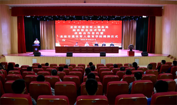 10月27日,閩西職業技術學院大匠堂內燈光閃耀、掌聲雷動,龍巖市退役軍人事務局和閩西職業技術學院戰略合作簽約暨龍巖市退役軍人教育學院揭牌儀式在這里隆重舉行。龍巖市人民政府副市長廖深洪蒞臨指導,閩西職業技術學院、龍巖市退役軍人事務局、四家優待證合作銀行領導及學院退役軍人大學生代表參加儀式。