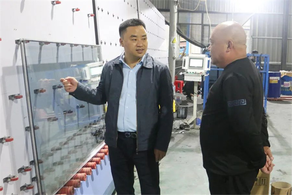 陳學林(左一)向劉宗銀了解鋼化玻璃生產情況。尤溪縣融媒體中心供圖 2020年,退役軍人劉宗銀看中西城鎮交通區位優勢,想在當地新建鋼化中空玻璃生產線項目,但遇到了園區道路、變壓器增容等方面的問題。陳學林得知后,立即組建專班,靠前服務,溝通自然資源、供電、工信、發改、公路等部門,通過現場辦公等方式,以“軍人速度”快速推動項目建設。據了解,這個項目實現了當年度引進、開工、投產、上規,次年實現產值4000多萬元。