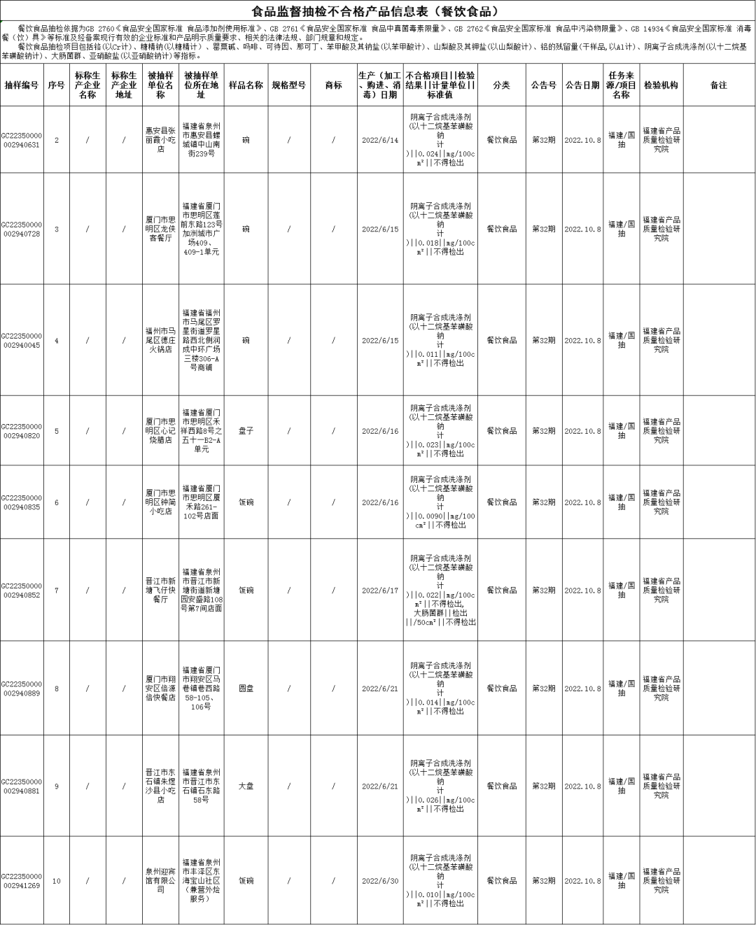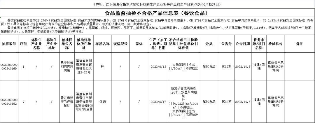 其他污染問題:惠安縣張麗霞小吃店的碗(消毒日期為2022年6月14日),陰離子合成洗滌劑(以十二烷基苯磺酸鈉計)不合格,檢驗機構為福建省產品質量檢驗研究院;廈門市思明區龍俠客餐廳的碗(消毒日期為2022年6月15日),陰離子合成洗滌劑(以十二烷基苯磺酸鈉計)不合格,檢驗機構為福建省產品質量檢驗研究院;福州市馬尾區德莊火鍋店的碗(消毒日期為2022年6月15日),陰離子合成洗滌劑(以十二烷基苯磺酸鈉計)不合格,檢驗機構為福建省產品質量檢驗研究院;廈門市思明區心記燒臘店的盤子(消毒日期為2022年6月16日),陰離子合成洗滌劑(以十二烷基苯磺酸鈉計)不合格,檢驗機構為福建省產品質量檢驗研究院;廈門市思明區鐘簡小吃店的飯碗(消毒日期為2022年6月16日),陰離子合成洗滌劑(以十二烷基苯磺酸鈉計)不合格,檢驗機構為福建省產品質量檢驗研究院;晉江市新塘飛仔快餐廳的飯碗(消毒日期為2022年6月17日),陰離子合成洗滌劑(以十二烷基苯磺酸鈉計)不合格、大腸菌群不合格,檢驗機構為福建省產品質量檢驗研究院;廈門市翔安區倍源倍快餐店的圓盤(消毒日期為2022年6月21日),陰離子合成洗滌劑(以十二烷基苯磺酸鈉計)不合格,檢驗機構為福建省產品質量檢驗研究院;晉江市東石鎮朱煜沙縣小吃店的大盤(消毒日期為2022年6月21日),陰離子合成洗滌劑(以十二烷基苯磺酸鈉計)不合格,檢驗機構為福建省產品質量檢驗研究院;泉州迎賓館有限公司的飯碗(消毒日期為2022年6月30日),陰離子合成洗滌劑(以十二烷基苯磺酸鈉計)不合格,檢驗機構為福建省產品質量檢驗研究院。