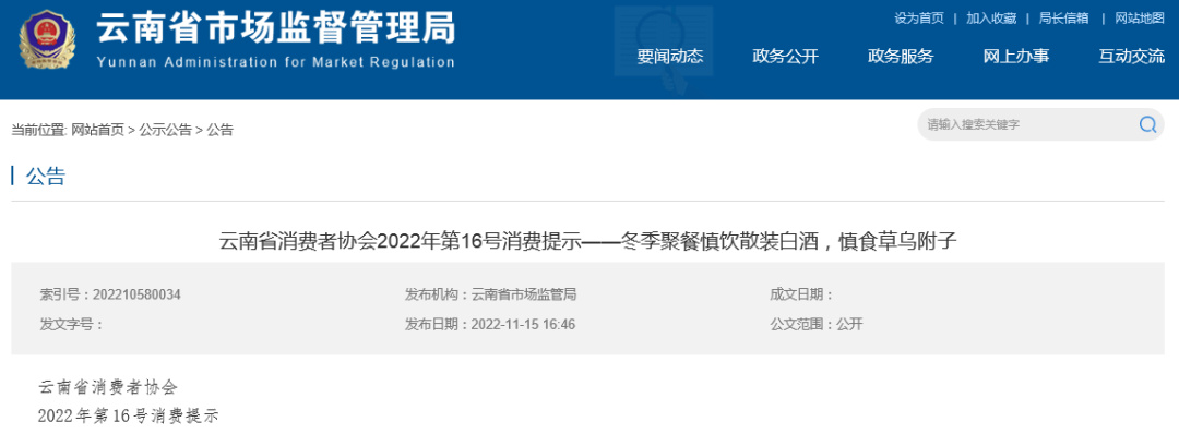 冬季聚餐慎飲散裝白酒,慎食草烏附子 一、消費者要樹立“自己是健康第一責任人”的健康理念,加強食品安全意識,正確選購和飲用白酒。01:選購正規廠家生產的散裝白酒,購買時查看標簽內容是否齊全,對明顯低于市場價格的散裝白酒要保持高度警惕,不采購、不飲用生產廠家不明、未經登記備案的小作坊生產加工的散裝白酒,不要購買、飲用私自勾兌和來源不明的散裝白酒;02:家庭自釀白酒嚴禁對外出售,不要在集體用餐中提供家庭自釀酒;03:農村集體聚餐主辦者嚴禁采購無合格檢測報告、生產廠家不明、未經登記備案的白酒小作坊生產加工的散裝白酒及自釀酒用于集體聚餐飲用;04:白酒生產經營者嚴禁購買、貯存和使用甲醇、工業酒精等非食品原料。使用醇基液體燃料的各類餐飲服務單位,要加強使用環節管理,專人專位管理存放,標貼明顯標識,做好領用登記,嚴禁同白酒混合存放。 二、草烏、附子不是食品!請廣大消費者慎食草烏、附子等毒性中藥材,避免中毒。01:正確認識草烏、附子等毒性中藥材,在無醫生指導的情況下不要擅自服食,做到不參與、不邀約、不聚眾食用草烏、附子;02:經營者應嚴格遵守《中華人民共和國食品安全法》《醫療用毒性藥品管理辦法》,不以任何方式經營以草烏、附子等毒性中藥材為原料的食品(包括自制泡酒)。 |