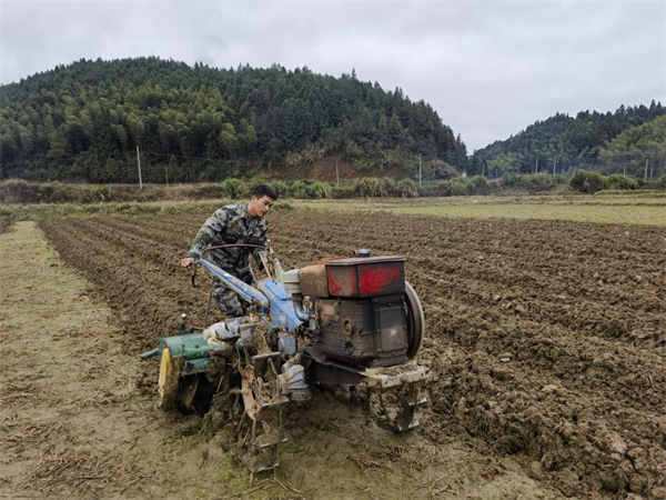 小山村里的奮斗者 2009年從部隊退役的丁水財開過出租車,當過小時工,也做過生意,多地輾轉了8年,時值28歲的他上有老下有小,繁忙的工作讓他無暇顧及家人的生活,不能時常陪伴父母、妻子和孩子讓丁水財感到十分愧疚。2017年,他毅然放棄了手頭的事業,回到了下渠鎮陳元村,自小與土地打交道的他靠著自身豐富的經驗扛起了鐵鍬和鋤頭,準備在水美土沃的家鄉大干一場。 “一開始,很多人勸我種經濟作物,說更掙錢,但我從小就聽著老人家講沒糧吃的苦日子,所以我選擇種糧,而且要多種糧、種好糧?!眲偦卮謇锏哪莾赡?,他一門心思埋頭苦干,但當理想扎根現實,艱難往往是超出想象的,病蟲害、種植技術、人力有限等一系列問題接踵而至,遠沒有想象中那么簡單。曾在軍營淬煉過的他始終堅持迎難而上,技術不精就努力學習。就這樣,丁水財的身影經常穿梭于各戶田野,經常參加各級農業技能培訓;漸漸地,良種陸續入田,結合科學有序的田間管理,丁水財迎來了第一個大豐收。這更加堅定了他種糧的決心,“習近平總書記說,中國人的飯碗要牢牢端在自己手里。我們就得按照習近平總書記說的,多種糧、種好糧,把這糧食的飯碗端的更牢?!倍∷斦f道。 振興路上的新農人 近幾年,由于外出務工人員多,缺少勞動力,導致出現了不同程度的耕地撂荒現象??粗謇锏牧袒牡卦絹碓蕉?,丁水財心里止不住地惋惜。在鎮黨委的帶領下、村兩委的幫助下,他通過與農戶簽訂合同流轉土地的方式,將下渠、陳元等村的撂荒地復耕復種,綜合應用農機與農藝配套栽培技術開展煙葉、水稻種植?,F如今,丁水財的農耕面積從原來的7畝擴大到40余畝,年收入也從原來的7萬元增長到30萬元,他的種植大業越做越紅火。作為農民中的新生力量,在自己增收之余,他還雇傭部分農戶幫忙進行土地托管,時不時的向他們傳授農技知識,提升耕種水平,進一步增加農戶收入。