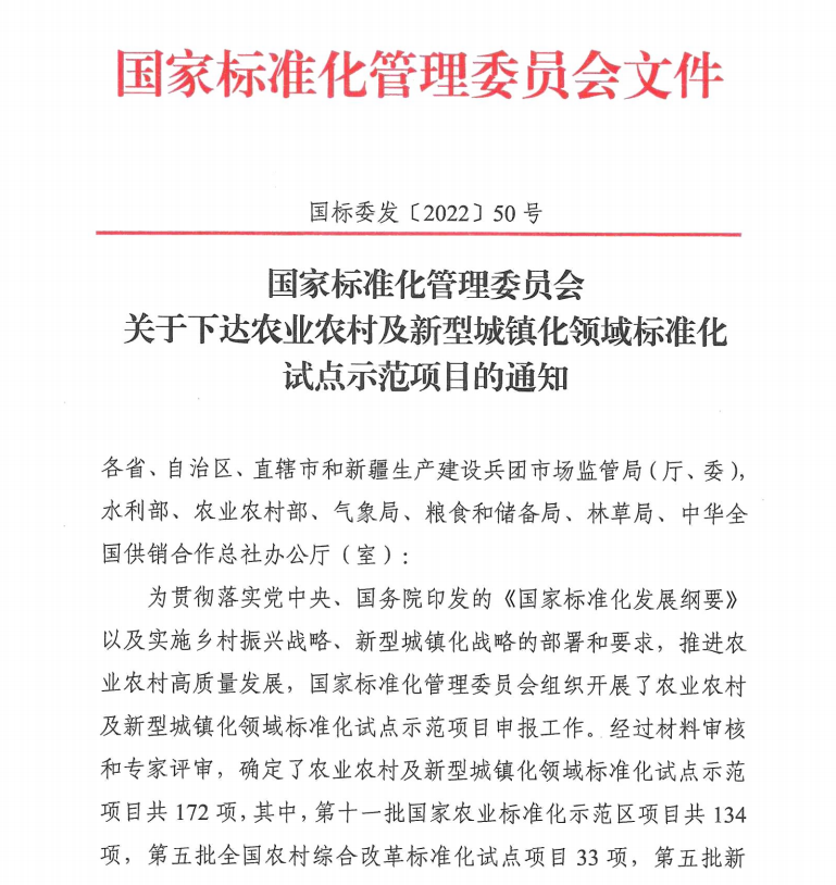 日前,國家標準化管理委員會發布了《關于下達農業農村及新型城鎮化領域標準化試點示范項目的通知》(國標委發〔2022〕50號),漳州市市場監督管理局指導推薦的福建嘉田農業開發有限公司獲批承擔“國家杏鮑菇良好農業規范生產標準化示范區”建設,長泰區農業農村局獲批參與“數字鄉村建設”試點。