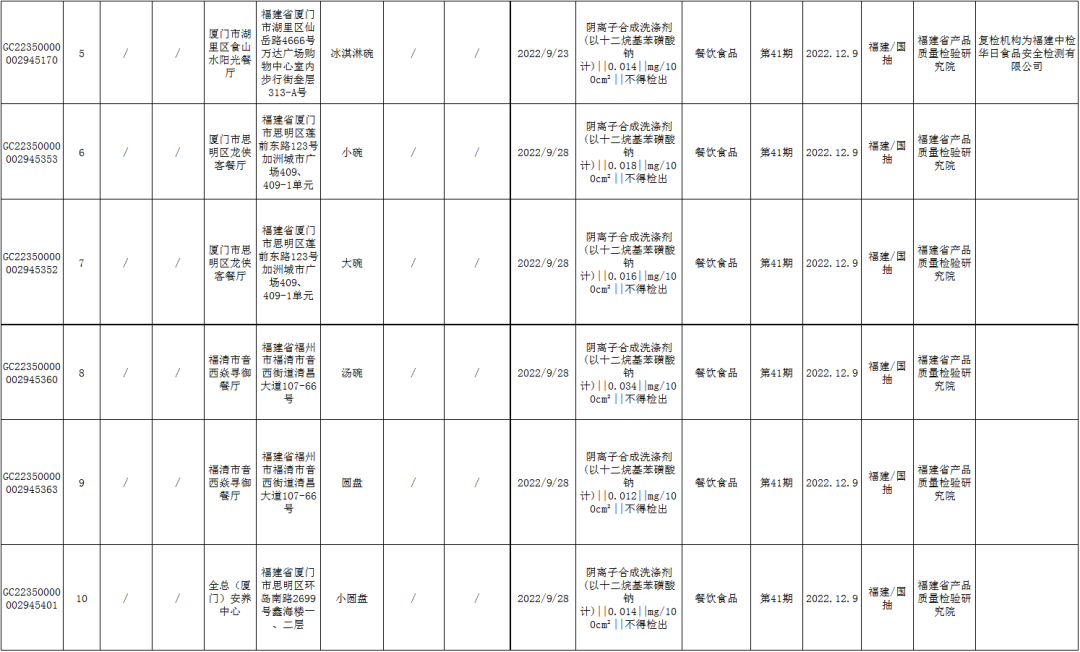 微生物污染問題 晉江尚白餐飲有限公司的三文魚(加工日期為2022年10月10日),菌落總數不合格、大腸菌群不合格,檢驗機構為廈門泓益檢測有限公司; 福州市晉安區源順餐飲店的復用瓷杯(消毒日期為2022年10月8日),大腸菌群不合格,檢驗機構為福州海關技術中心; 福清市音西榕豐餐廳的飯碗(消毒日期為2022年9月29日),大腸菌群不合格,檢驗機構為福建省產品質量檢驗研究院; 福清市音西榕豐餐廳的湯碗(消毒日期為2022年9月29日),大腸菌群不合格,檢驗機構為福建省產品質量檢驗研究院; 廈門市丫滿意女王餐飲管理有限公司的小碗(消毒日期為2022年10月13日),陰離子合成洗滌劑(以十二烷基苯磺酸鈉計)不合格、大腸菌群不合格,檢驗機構為福建省產品質量檢驗研究院; 標稱寧德市福林水產有限公司2022年8月9日生產的即食海蜇,菌落總數不合格,銷售單位為寧德鑫永濤超市有限公司,檢驗機構為福建賽福食品檢測研究所有限公司。