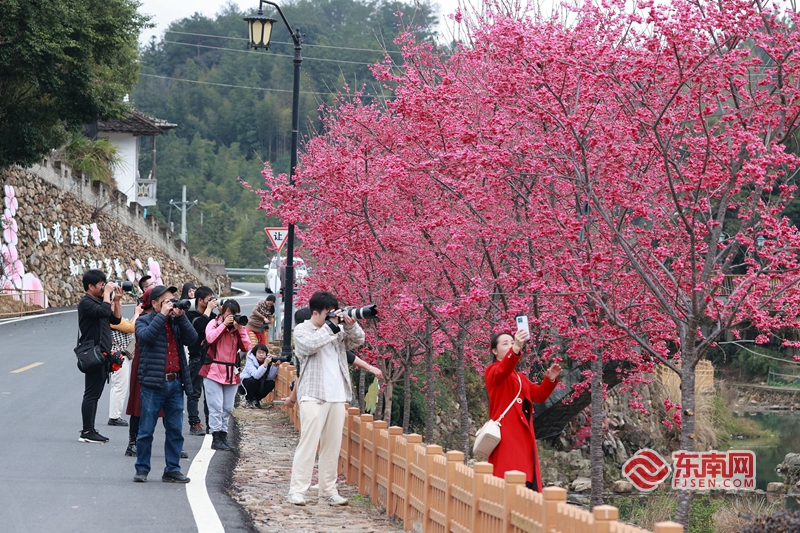 艷麗的櫻花吸引了許多攝影愛好者前來取景。陳英杰 攝 東南網2月15日訊(通訊員 陳英杰)初春的閩南大地,一派勃勃生機。日前,德化縣“花開瓷都·‘櫻’你浪漫”櫻花節活動在雷峰鎮潘祠村櫻花園舉辦, 千畝近100萬株福建山櫻花優雅綻放、競相爭艷,宛若“群櫻薈萃”,成為雷峰鎮一道獨特的風景線,吸引眾多游客爭相來打卡體驗。