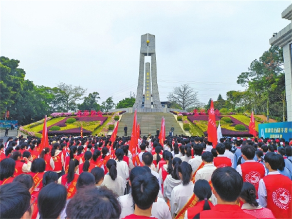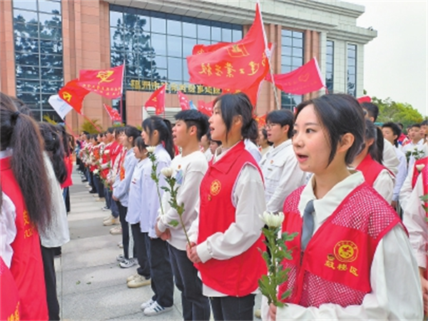 千余名學生和志愿者參加悼念活動 上午9時,文林山革命英烈紀念園內,手持白花的參與者整齊列隊,表情莊嚴肅穆?!爱斠鄻窢奚嵘砼c汝身之福利,為天下人謀永福也!”“就讓你們的槍聲,成為我們婚禮的禮炮吧!”“憑將一掬丹心在,泉下差堪對我翁?!薄顒娱_始,來自福州大學至誠學院人文藝術系的同學們身著表演服,在紀念碑前的臺階上進行沉浸式角色扮演。他們先后朗誦林覺民《與妻書》片段、徐琛和余哲貞烈士犧牲前留言以及吳石將軍的絕命詩等先烈經典名言和詩句。 飽滿的激情和抑揚頓挫的語調,點燃了全場熱情,在場1000多名參與者一起跟誦,通過革命先烈的名言,追憶他們的豐功偉績。鏗鏘有力、飽含深情的話語聲,回蕩在文林山的松林間。