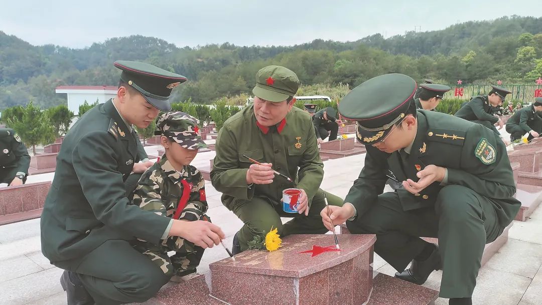 4月2日,在龍巖市永定區,老戰士熊兆祥與部隊官兵、少年軍校學生共同為烈士墓碑描紅。范啟椿 攝 朗誦詩文敬英雄 清明祭英烈,詩文寄哀思。 4月1日,崇尚·2023清明祭英烈——“回響”紅色經典誦讀活動在福州市文林山革命英烈紀念園舉行,來自福州市20多所院校的1000多名師生及社會志愿服務團隊成員參加。手持白花的參與者整齊列隊,表情莊嚴肅穆。 “當亦樂犧牲吾身與汝身之福利,為天下人謀永福也!”“就讓你們的槍聲,成為我們婚禮的禮炮吧!”“憑將一掬丹心在,泉下嗟堪對我翁?!备V荽髮W至誠學院人文藝術系的學生身著表演服,在紀念碑前的臺階上朗誦了林覺民《與妻書》片段、徐琛和余哲貞烈士犧牲前留言以及吳石將軍的絕命詩等先烈經典名言和詩句。1000多名參與者跟誦,鏗鏘有力、飽含深情的話語聲回蕩在文林山的松林間。 “會稽恥,終須雪。楚三戶,教秦滅。愿英靈,永保金甌無缺……”領誦人中,一名身著軍裝、白發蒼蒼的老人格外引人注目。他是福州市退役軍人事務局上海西軍休所軍休干部姜膠生?!拔依收b的是郁達夫1937年9月在福州創作的《滿江紅》,是紀念民族英雄戚繼光的。朗誦這首有著特別意義的作品,不但是為了紀念民族英雄戚繼光,也是為了傳承不甘屈辱、同仇敵愾的精神,這能更好激發同學們的愛國熱情?!?/p> “當我朗誦吳石將軍的絕命詩時,我一下子覺得,和革命先烈當年的艱難處境相比,如今生活中的一些困難都不值一提。先烈的犧牲不但為我們創造了更好的生活,也給我們留下了寶貴的精神遺產?!爆F場領誦的福州大學至誠學院人文藝術系學生雷博軒說。