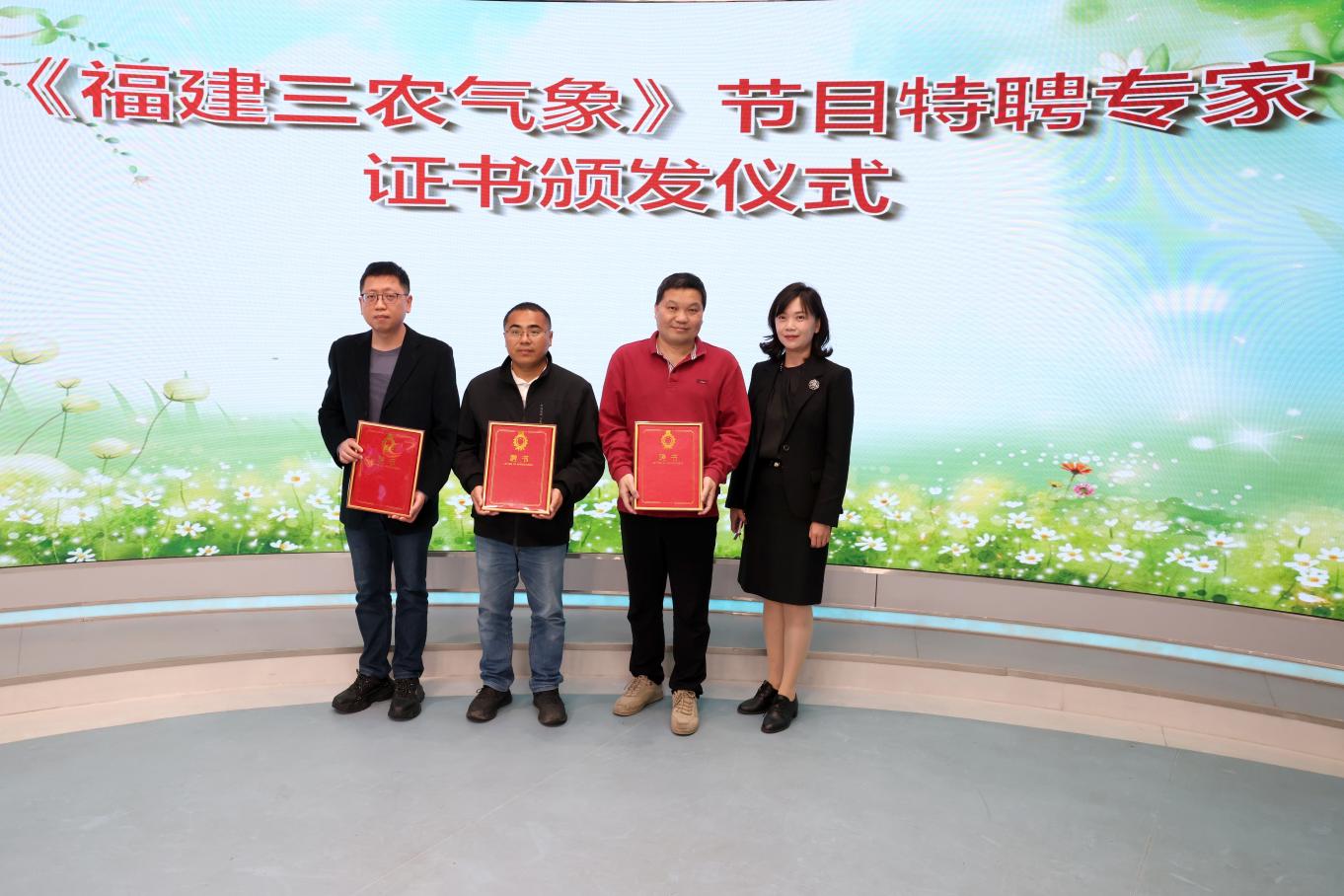 現場,福建省委網信辦副主任劉建斌,福建省農業農村廳二級巡視員姚文輝,致公黨福建省委會專職副主委、福建省政協常務委員、副秘書長吳棉國,福建省氣象局黨組成員、副局長馮玲等領導共同為“福建三農氣象欄目組”揭牌,并向福建省氣象科學研究所正研級高工楊凱,福州市氣象局農試站站長、高級工程師蘇榮瑞,福州市海洋與漁業技術中心高級工程師吳品煌3位農業領域特聘專家頒發聘書。