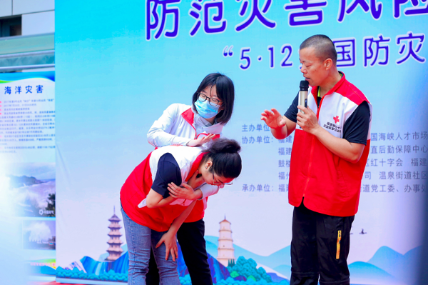 活動現場,駐省應急廳紀檢監察組和省退役軍人事務廳領導為社區居民代表發放急救包;省減災中心向東大社區贈送《臺風知識與應急避險》繪本;福建省紅十字現場救護培訓中心的老師們現場互動教授創傷包扎方法和氣道梗阻急救法(海姆利克急救法)。