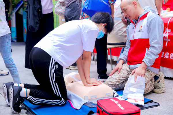 紅十字會還為居民宣傳普及防溺水知識、心肺復蘇現場教學;星光救援隊為居民講解家庭防火自救知識、科普繩索救援知識、展示救援設備;海容社工開展“有備無患”游園互動游戲,進一步提高居民家庭的自我救援能力。