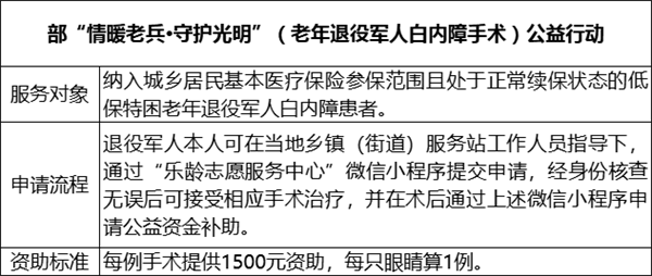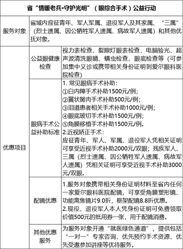 目前,我省已被退役軍人事務部列為“情暖老兵·守護光明”公益行動首批試點省份。省退役軍人服務中心指導省退役軍人關愛協會、愛爾眼科醫院福建省區同步推進部、省兩項公益行動,目前,已完成前期工作,下一步將在全省范圍內開展眼健康義診活動和手術治療服務。 部、省“情暖老兵·守護光明”公益行動內容