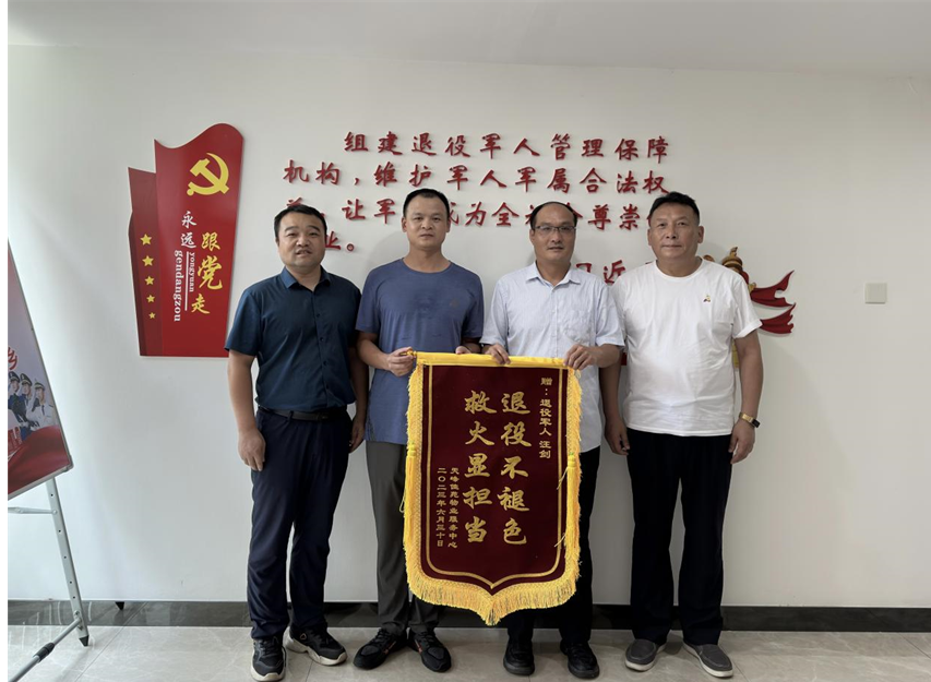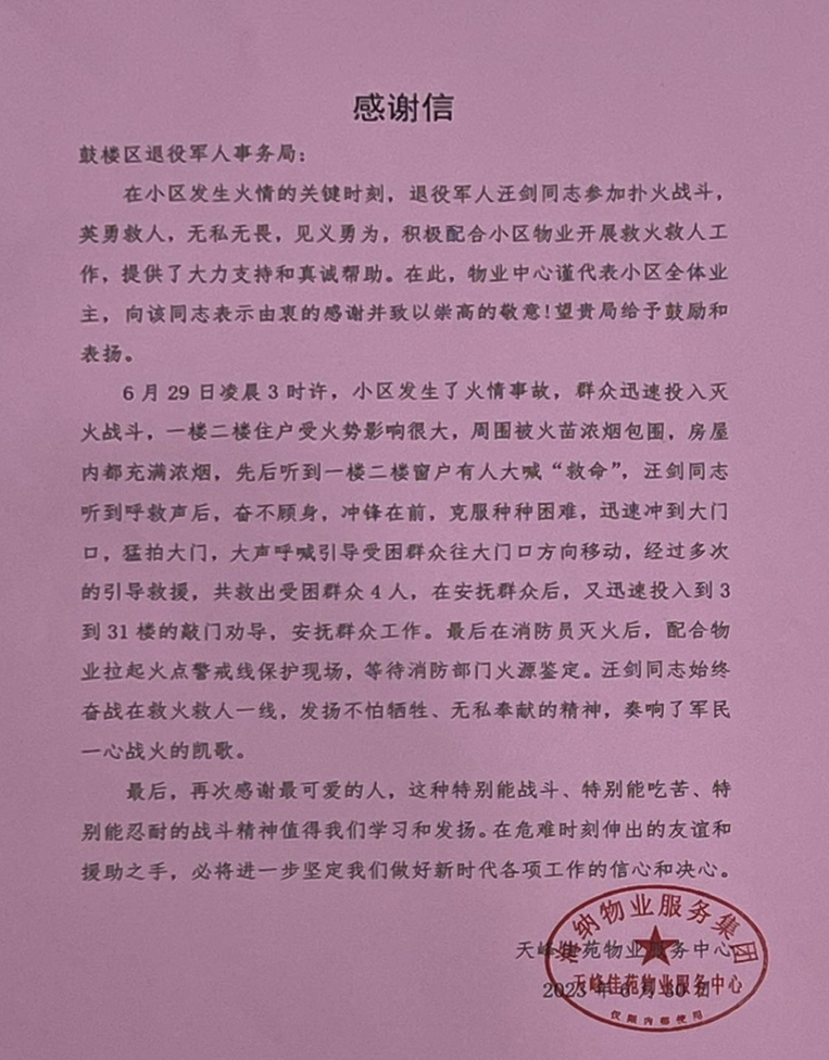 7月14日上午,福州市鼓樓區五鳳街道某小區物業代表來到鼓樓區退役軍人事務局送上錦旗和感謝信,對今年鼓樓區新接收的安置士官汪劍英勇救火的行為表示感謝。