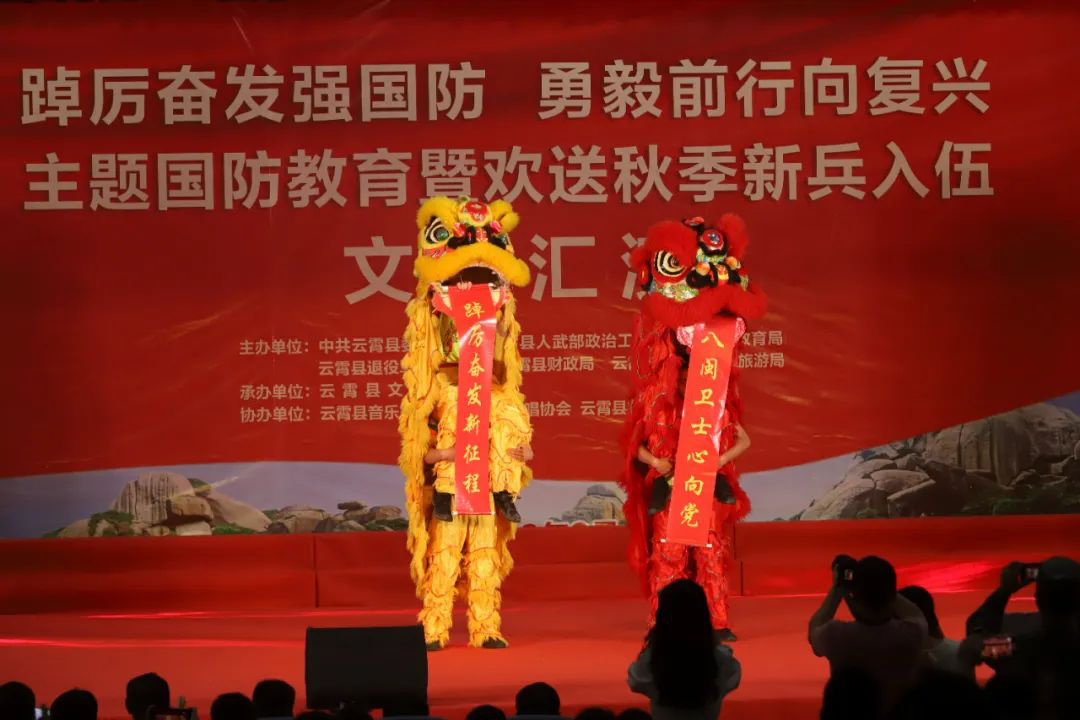 9月16日是第23個全民國防教育日。云霄縣為即將踏上軍旅的2023年秋季入伍新兵及家長們送上一場精彩紛呈的文藝匯演,以閩南非遺為主的軍旅文藝題材向新兵們展示了云霄人民愛子弟兵的雙擁熱情。 學非遺、品民俗、悟傳統,讓非遺傳承“潮”起來,“非遺”是云霄地方特色文化的展示,云霄箏《山丹丹開花紅艷艷》、云霄剪紙展示、潮劇《一片丹心衛國邦》等非遺節目精彩紛呈,激情澎湃,既弘揚了愛國主義旋律,又增強了全民國防觀念,更是讓人耳目一新。臺下觀眾神采飛揚、熱情高漲,掌聲、歡呼聲一浪高出一浪。 與此同時,舞獅表演、武術表演、閩南語串燒......一個個節目輪番上演,演出在新兵們的大合唱《強軍有我》中落下帷幕。整場演出既有地方特色,又有軍營色彩,既有互動交流,又有才藝展示,新兵們在享受非遺文藝匯演中接受一次深刻的國防教育洗禮,更加堅定從軍報國之志,扎根軍營,爭做新時代“四有”軍人的理想信念。 洛江區