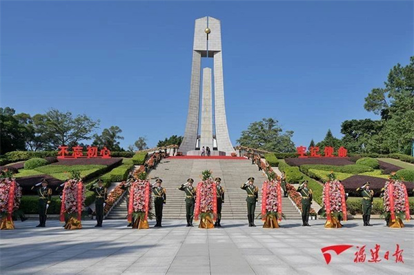 在我國第十個烈士紀念日到來之際,9月30日,福建省、福州市在福州文林山革命烈士陵園隆重舉行向革命烈士敬獻花籃儀式。省委書記、省人大常委會主任周祖翼,省委副書記、省長趙龍,駐閩部隊領導唐興華,與省、市各界代表一道,向革命烈士紀念碑敬獻花籃。 浩氣存天地,青山護忠魂。秋日金暉中,蒼松翠柏環繞的文林山革命烈士陵園莊嚴肅穆,革命烈士紀念碑巍然屹立。廣場臺階前,以省委,省人大常委會,省政府,省政協,駐閩解放軍和武警部隊官兵,省各民主黨派、工商聯和無黨派人士,省各人民團體和省、市各界群眾,老戰士、老同志和烈士親屬,全省少先隊員名義分別敬獻的9個花籃一字排開,花籃紅色緞帶上書寫著“革命烈士永垂不朽”的金色大字。 上午9時整,儀式開始。在雄壯的《義勇軍進行曲》中,全場齊聲高唱中華人民共和國國歌。國歌唱畢,全體肅立,向革命烈士默哀。默哀畢,手持鮮花的少先隊員齊聲獻唱《我們是共產主義接班人》,并面向革命烈士紀念碑致少年先鋒隊隊禮。