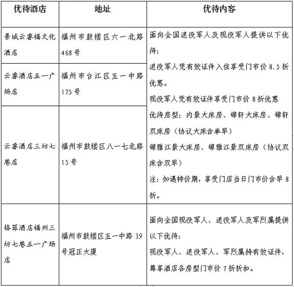 儀式上,田德強表示,鼓樓區是駐軍大區,素有擁軍優屬,擁政愛民的光榮傳統,非常感謝擁軍酒店支持鼓樓區雙擁工作,以最大的優惠和誠意服務現役和退役軍人。 酒店負責人紛紛表示加入鼓樓區“愛國擁軍聯盟”既是榮譽更是責任,今后酒店將強化管理、優化服務,讓廣大現役軍人、退役軍人和軍屬充分感受到溫暖,為鼓樓區雙擁工作增光添彩。 根據協議,福州星宸未來酒店管理有限公司旗下景城云睿福文化酒店、云睿酒店五一廣場店、云睿酒店三坊七巷店,福州金星商務酒店有限責任公司(格菲酒店)將提供以下優待: 擁軍酒店住宿優待目錄清單