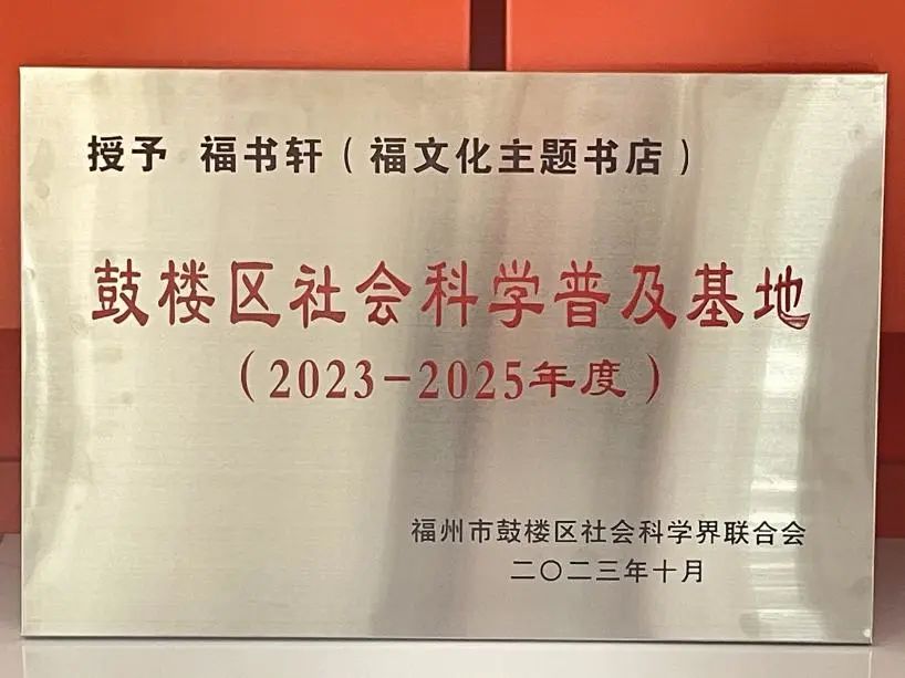 近日,福州市鼓樓區社會科學界聯合會授予福書軒(福文化主題書店)“2023-2025年度鼓樓區社會科學普及基地”。