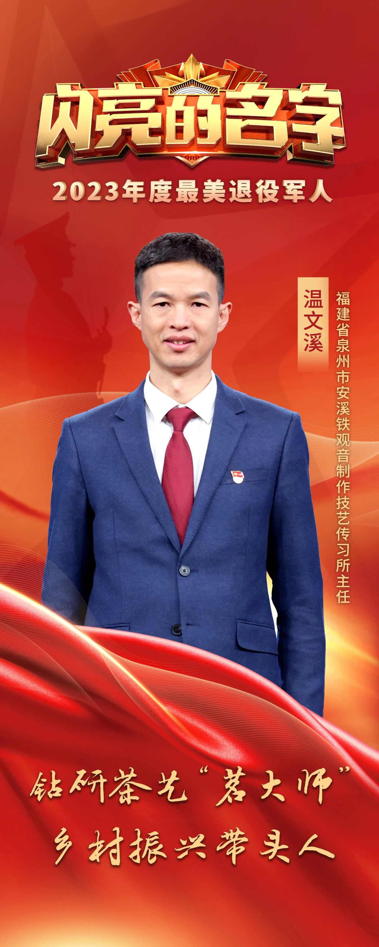 近日,中央宣傳部、退役軍人事務部、中央軍委政治工作部聯合發布了2023年度“最美退役軍人”,我省老兵溫文溪在列!下面讓我們一起來看關于他的事跡。 溫文溪,男,漢族,中共黨員,1978年9月出生,本科學歷,1995年12月入伍,1999年12月退伍。福建省泉州市安溪鐵觀音制作技藝傳習所主任。 2022年當選為黨的二十大代表;2021年作為全國先進模范人物代表受邀進京參加慶祝中國共產黨成立100周年系列活動;先后榮獲“全國優秀農民工”“中國制茶大師”“福建省勞動模范”“福建省最美退役軍人”等榮譽稱號。