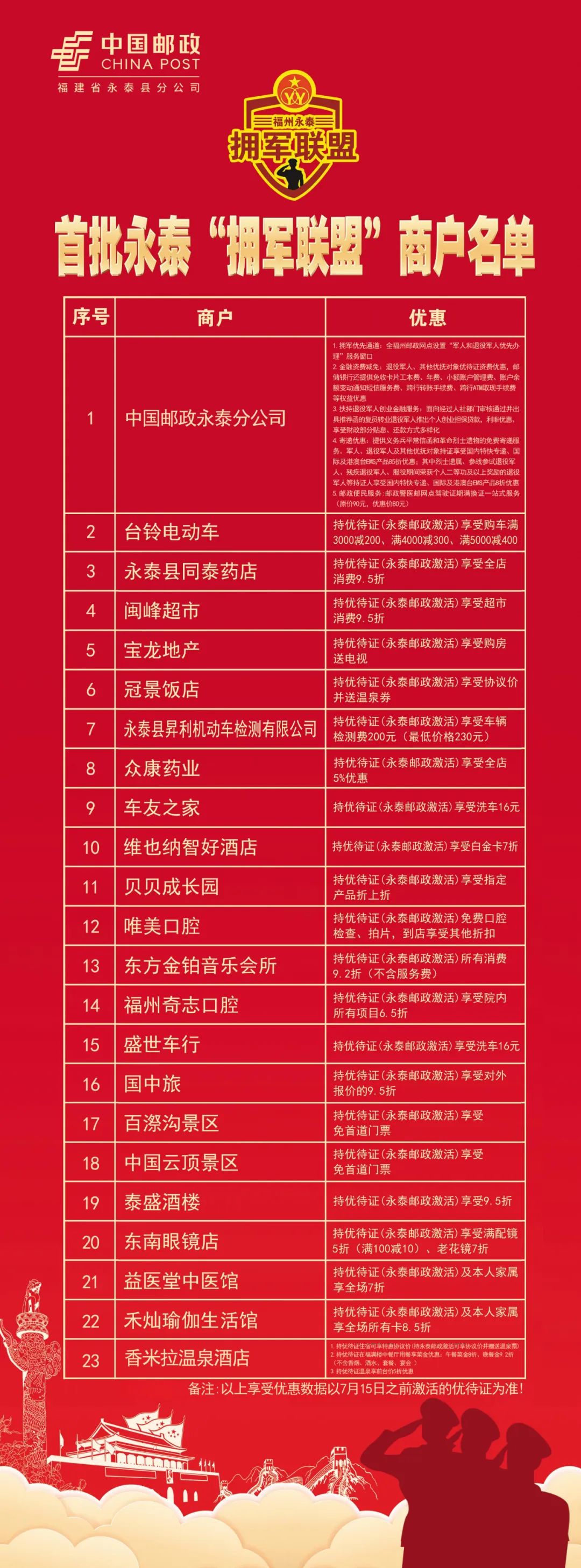 目前,永泰縣“擁軍聯盟”共有商戶23家,將在商貿商超、金融保險、餐飲娛樂、醫療康養、文化旅游、交通物流、教育培訓、商品房銷售等方面為退役軍人提供優惠商品和優質服務。