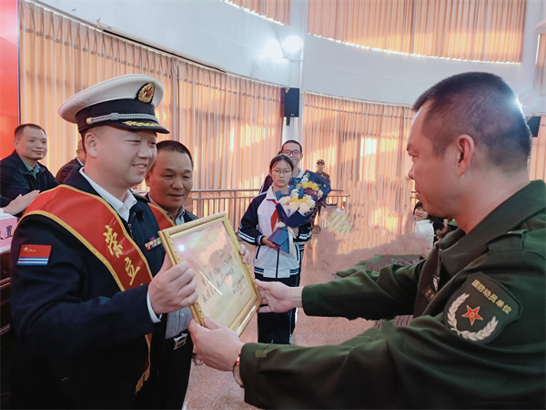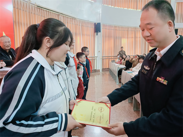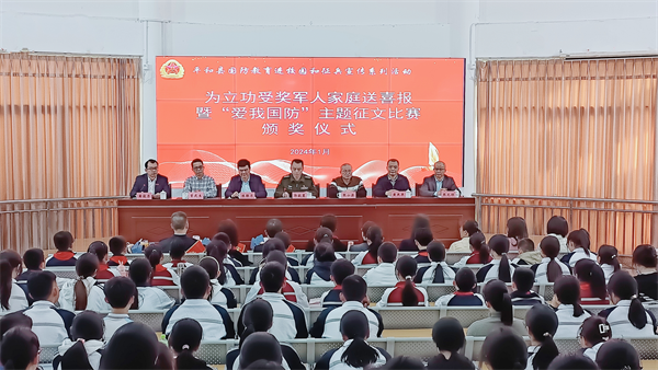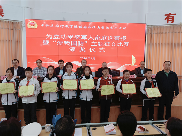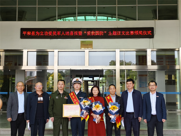 在師生代表的見證下,平和縣人武部政委郭毅置為曾致銜及家屬佩戴上“榮立三等功,軍屬光榮”綬帶,送上立功喜報及慰問金。曾致銜則和當地有關部門一起,為獲得主題征文獎的師生頒發榮譽證書,現場響起雷鳴般掌聲。