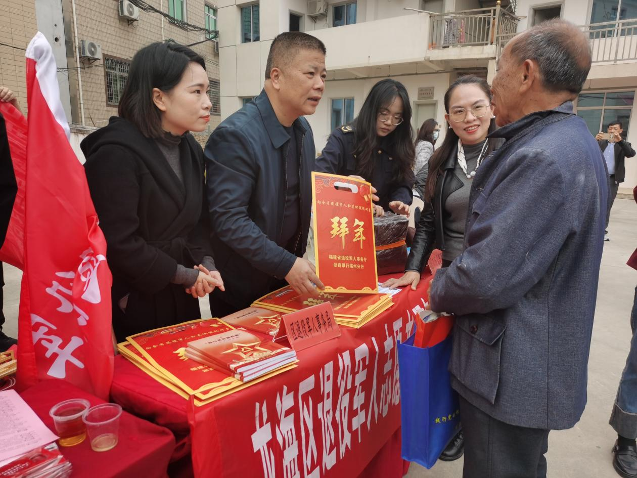 活動中,退役軍人代表熱情開展“我與老兵面對面”宣講活動,宣傳習近平新時代中國特色社會主義思想,訴戰友情誼,聊鄉村振興,談國家發展;退役軍人志愿者服務隊積極為持有優待證的退役軍人分發春聯;龍海農商銀行發揮金融擁軍優勢,積極為退役軍人宣講就業創業優惠政策,宣傳推廣“擁軍貸”和“創業貸”,為退役軍人創業就業解燃眉之急;國壽財險推出退役軍人家庭專屬防癌抗癌專屬保險卡,針對低保、特困退役軍人,進行免費辦理。