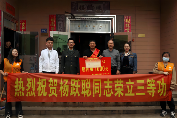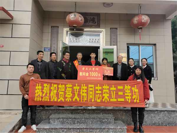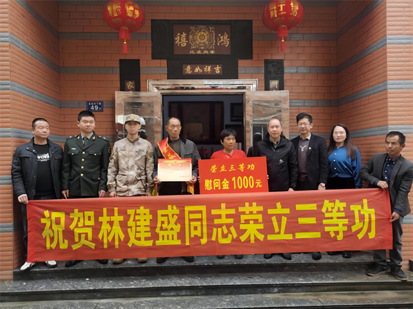 喜報頻傳桑梓地,榮耀常駐功臣門。1月30日-2月1日,龍海區退役軍人事務局與區人武部聯合開展“為立功軍人送喜報”活動。先后為榮立三等功現役軍人海澄鎮鐘嶼旭、蔡文偉,紫泥鎮林建盛,隆教鄉楊躍聰家屬送上立功喜報及慰問金,并帶去春節的祝福和問候。